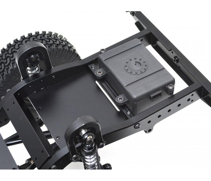 The chassis includes Team Raffee Co. Complete Scale Axles, steel front and rear driveshafts, driveshaft from the motor to transfer case, aluminum shocks, 1.9 Beadlock wheels and tires, transmission, T-case, aluminum links, HD gears, battery plate, body mounts, skid plate, aluminum links and plastic ball ends, rails and bumpers, shock towers and receiver box. The body is also included.