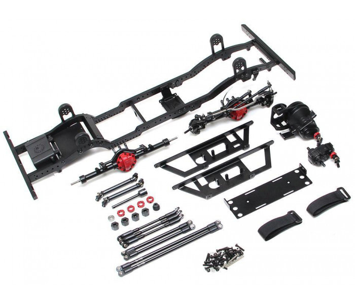 Includes Team Raffee Co. Scale Axles, Voodoo driveshafts, transmission, T-case, aluminum links, HD gears, battery plate, mounts, skid plate, bumpers, shock towers, and receiver box. Does not come with shocks, wheels, and tires.