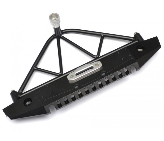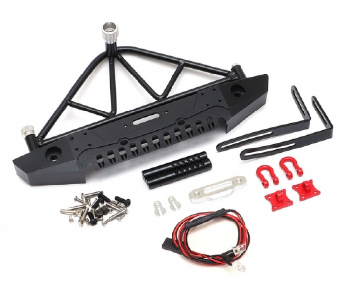 This is a rear steel bumper that will fit on SCX10 with a spare wheel holder it also has a location for a winch which has loads of different mounting holes for different types of winches. It comes supplied with 2 different mounting posts so you are able to mount the bumper to different rigs. In the bag you will also get some scale tow hooks and 2 LED’s with all the necessary mounting screws.